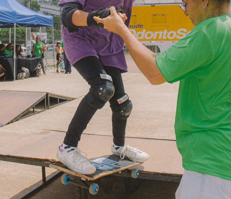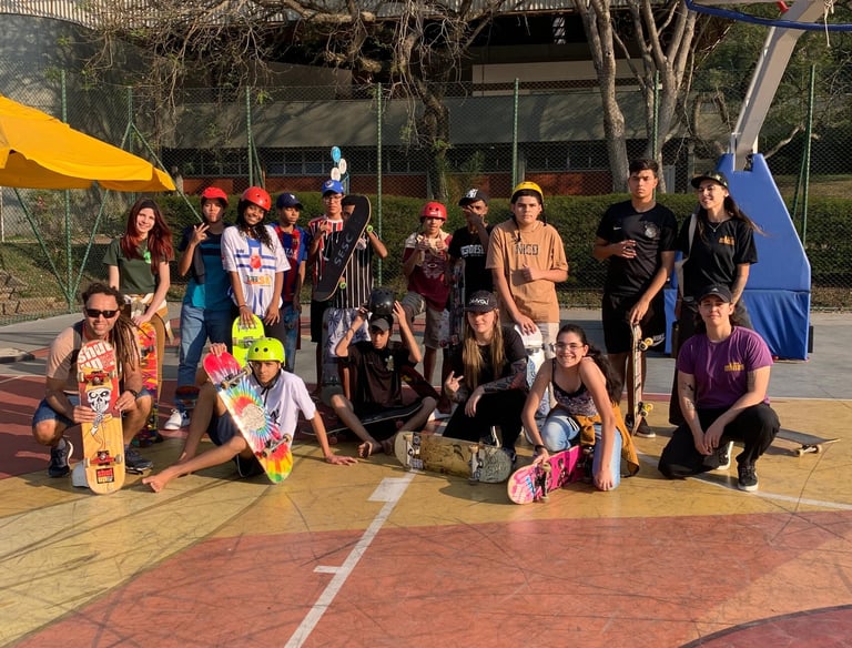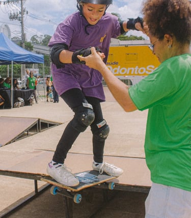 Ações que unem skate e conversa: vivências com adolescentes do projeto Juventudes e atividades especiais com as crianças do projeto Curumim, criando momentos de aprendizado, escuta e integração.